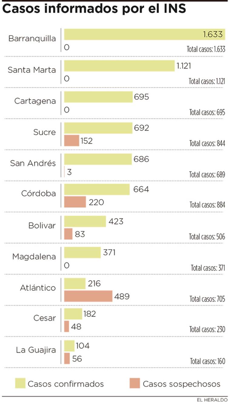 Según las cifras del Instituto Nacional de Salud, Barranquilla es donde más se reportan casos, seguida de Santa Marta y Cartagena (ver infografía).