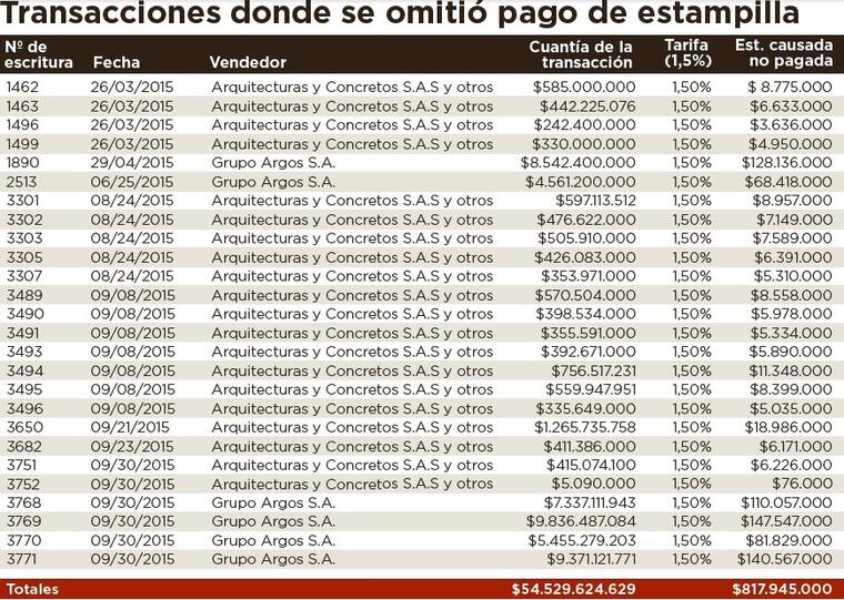 La Notaría Tercera de Barranquilla no verificó el pago del 1,5% del valor de la estampilla Prohospital de primer y segundo nivel en 26 escrituras, transacción comercial realizada por el Grupo Argos que suma 54 mil millones de pesos, razón por la que el Distrito dejó de percibir $817 millones (ver recuadro).