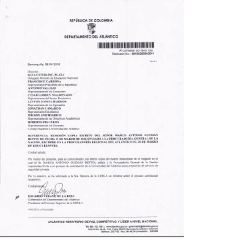 El documento donde alertan las supuestas anomalías fue firmado por Marcos Antonio Guzmán Bettin, especialista en administración de la seguridad, magister en seguridad pública y quien fue el responsable de esa misma área en la administración de la exrectora Ana Sofía Mesa. Así mismo, fue radicado en la Gobernación del Atlántico el pasado 28 de marzo, para ser remitido al gobernador Eduardo Verano, quien preside el Consejo Superior.