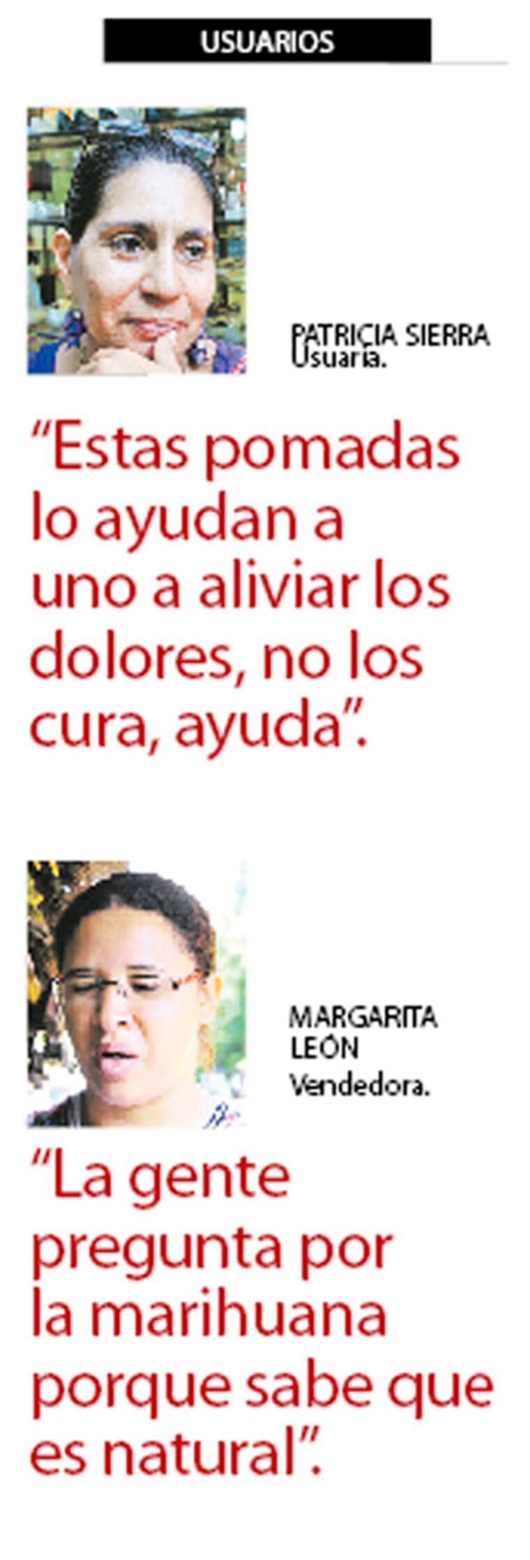 Patricia Sierra sufre de fuertes dolores en sus piernas y desde hace más de 10 años compra pomadas de marihuana para aliviar los intensos calambres que le dan por las noches. Patricia relata que para ella ya no basta con consumir las pastillas medicadas por el especialista, pues sus dolores con los años se han vuelto insoportables. 'Estas pomaditas de marihuana ayudan a quitar los dolores, no los curan, pero sí alivia bastante', señala.