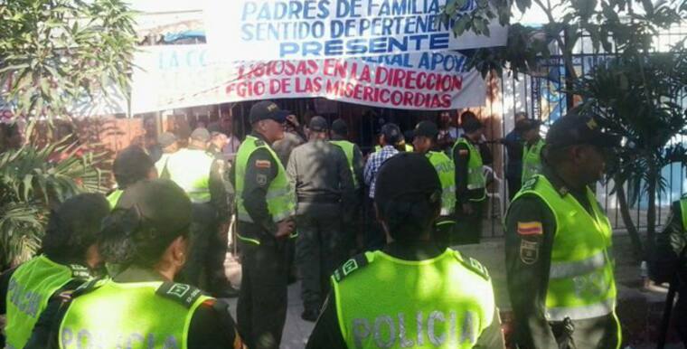 La Policía entró al colegio Nuestra Señora de Las Misericordias para permitir el ingreso de la nueva rectora de la institución, la señora Rosa Belén Suárez, ante la protesta de los padres de familia.