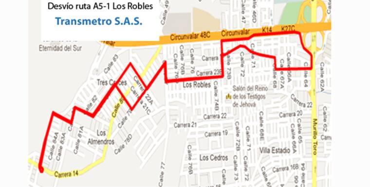 'Este servicio alimentador sale, como es habitual, del paradero ubicado afuera de la estación Pedro Ramayá por la carrera 23 hasta llegar a la calle 68, la que recorre hasta la carrera 18 Sur, busca la calle 74 y por esta vía la carrera 23A hasta llegar a la calle 77 que recorre hasta la calle 79, tomándola hasta la carrera 21 y llega a la calle 81. En la carrera 18C gira y toma la calle 83 hasta la carrera 18 para llegar a la calle 84 con carrera 14 y nuevamente tomar la calle 84 hasta la carrera 18 buscando la calle 83, que recorre hasta la carrera 18C y luego toma por calle 81 sigue su recorrido habitual de retorno a la estación Pedro Ramayá', dice Transmetro.