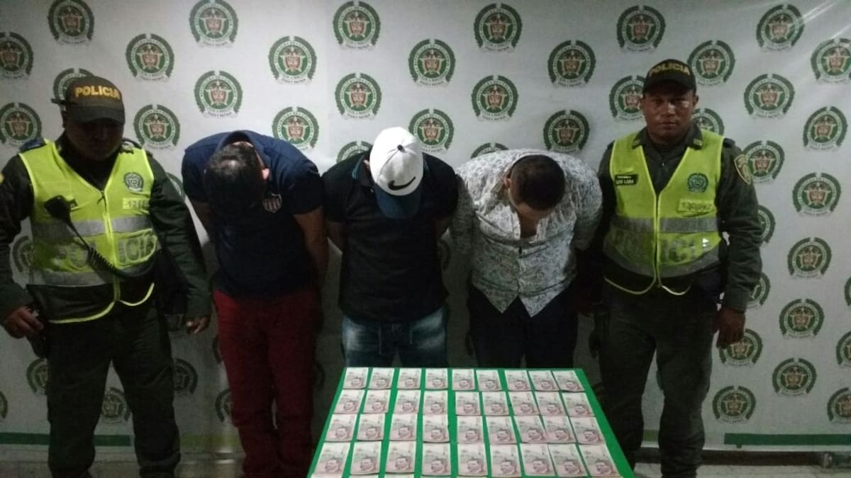 Rubén Darío Cantillo, Edwin Enrique Sánchez, y Bryan Guillermo Gómez Garcés, sindicados del delito de tráfico de moneda falsa, fueron apresados luego que a raíz de una discusión que terminó en golpes con el administrador del negocio, se descubriera el ilícito que pretendía cometer.