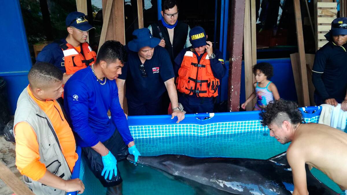 El capitán de fragata, Javier Bermúdez, comandante de la estación de guardacostas Santa Marta, manifestó que 'al ver que el animal prácticamente no se movía uno de los tripulantes se lanzó al agua y comprobó que estaba vivo'.