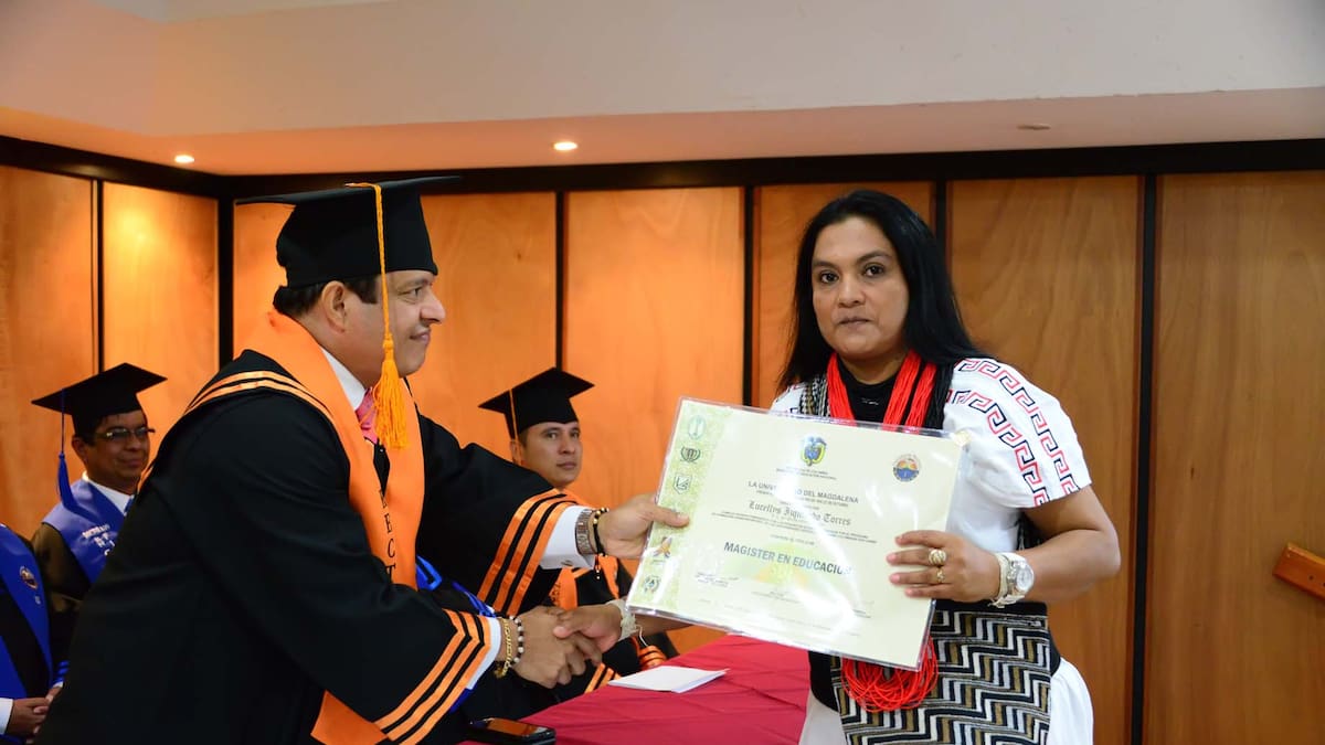 Vestida con su tradicional atuendo arhuaco, una manta tejida con lana de oveja y adornado con varios collares de colores, Lucellys Izquierdo Torres recibió de manos del rector Pablo Vera Salazar, el diploma que certifica su graduación como Magíster en Educación, y que la convirtió en la primera mujer perteneciente a una comunidad indígena en conseguir un título en la modalidad de postgrados de Unimagdalena.