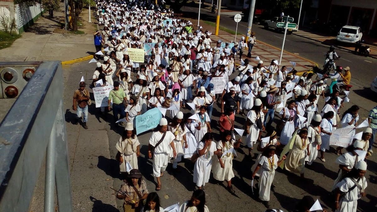 Cientos de arhuacos recorrieron este jueves las avenidas del norte al centro de Valledupar para concentrarse en la plaza Alfonso López, donde continúan en una protesta pacífica por las afectaciones de la minería en la Sierra Nevada de Santa Marta.