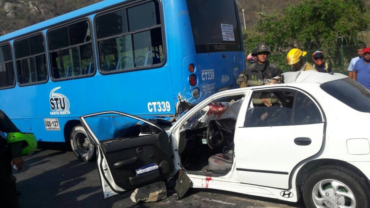 El choque de un automóvil con una buseta del servicio público urbano en el corredor turístico de Santa Marta, sector de Pozos Colorados, dejó tres muertos y un menor de edad herido.