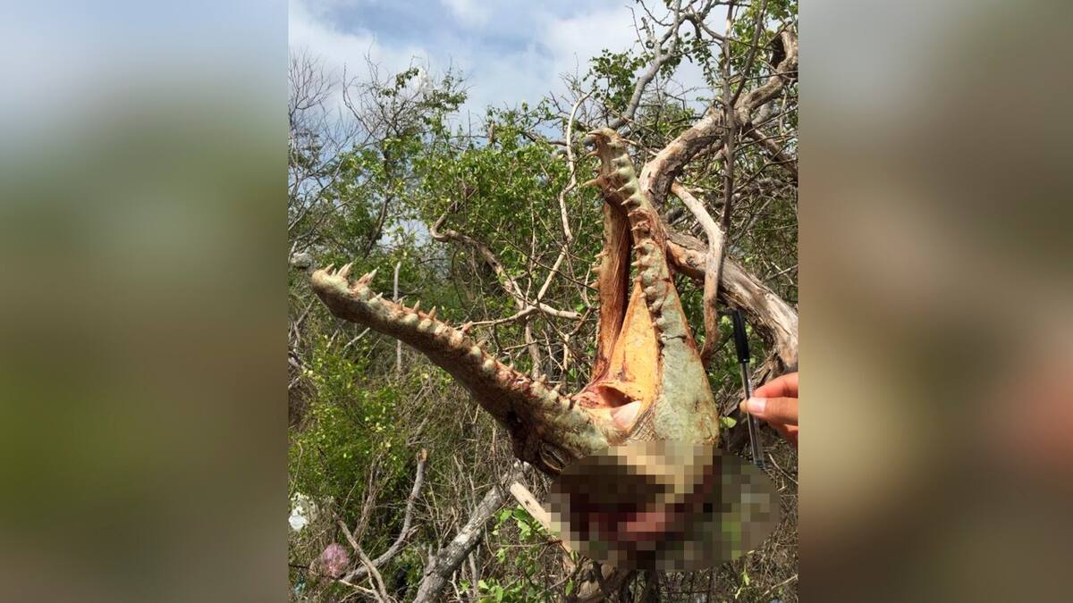 El Kayuüshi, nombre que recibe la especie en lengua Wayuunaiki, con una longitud de dos metros y medio, fue hallado sin vida en las proximidades del centro poblado del corregimiento de Camarones, donde se encontró la cabeza (colgada de un árbol) y el cuerpo del animal en el suelo. Todo hace pensar que quienes le dieron muerte lo hicieron para consumo.