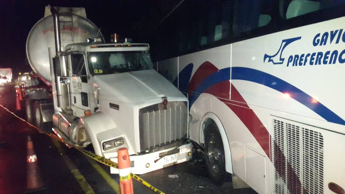 Finalmente, el primer carro cisterna se estrelló contra el bus afiliado a la empresa Expreso Brasilia con número de placa SMI-836, resultando la situación solamente con daños materiales.