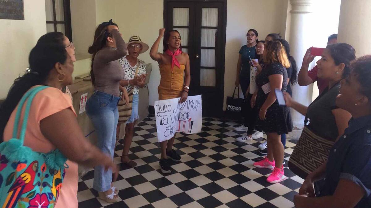 Integrantes de colectivo Mujeres del Magdalena protestó ayer en la sede de la Asamblea Departamental en rechazo a la permanencia del diputado Julio David Alzamora como presidente de la Corporación, pese a que está incurso en un proceso por acceso carnal violento agravado.