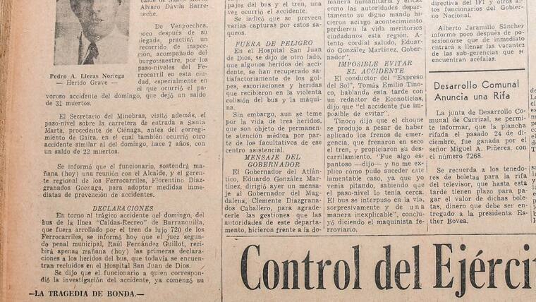 Jorge Luis Lleras, que contaba con 15 años, narra que dentro del bus, muchos le gritaban al chofer. 'Hey loco, dale despacio, vas muy duro. Íbamos a El Rodadero, pero a última hora decidieron que fuéramos a Bonda. Luego nos montamos otra vez al bus. Le pregunto la hora a mi papá y él me responde: son las 12 y 15. En ese momento veo cuando viene el tren. Yo iba entre dos vecinos, José García y Guillermo González que desgraciadamente murieron. Por el impacto permanecí en shock nervioso durante un mes. Y tenía pánico de subirme a un bus.