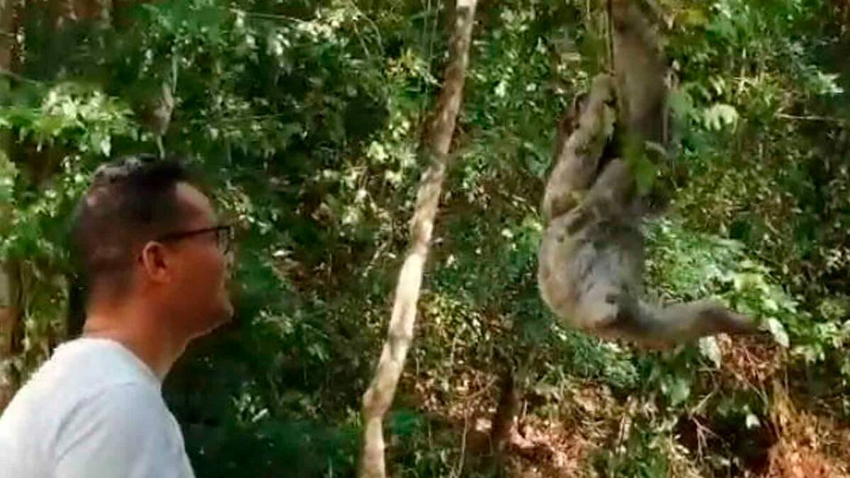 El animal, que suele estar colgado en las ramas, alimentándose, moviéndose lentamente o simplemente durmiendo, provocó la admiración de los funcionarios quienes llegaron a acariciarlo, y a observar extasiados cómo volvía a la copa con su andar parsimonioso.