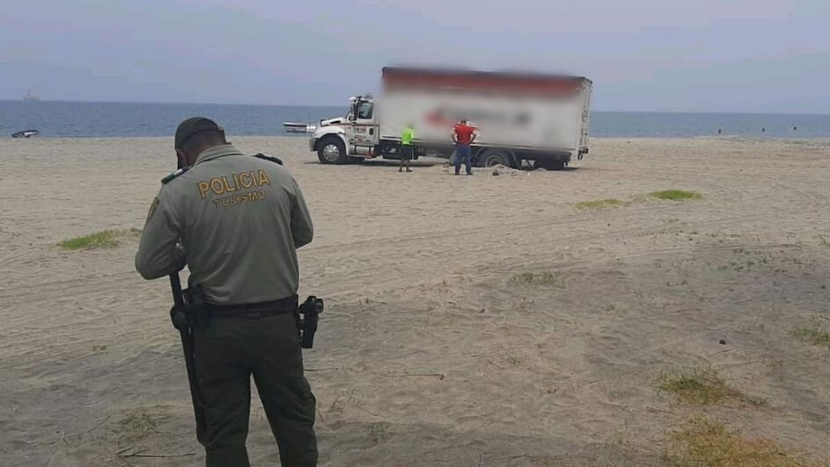 'Personal que realizaba labores de patrullaje en el sector turístico de Bello Horizonte sorprendió a un camión de una empresa transportadora de alimentos en plena playa. El conductor manifestó que solo pretendía tomarse una foto de recuerdo, pero no contó con quedarse atascado en medio de la arena', dijo el coronel Oscar Solarte, jefe de la Mesan.