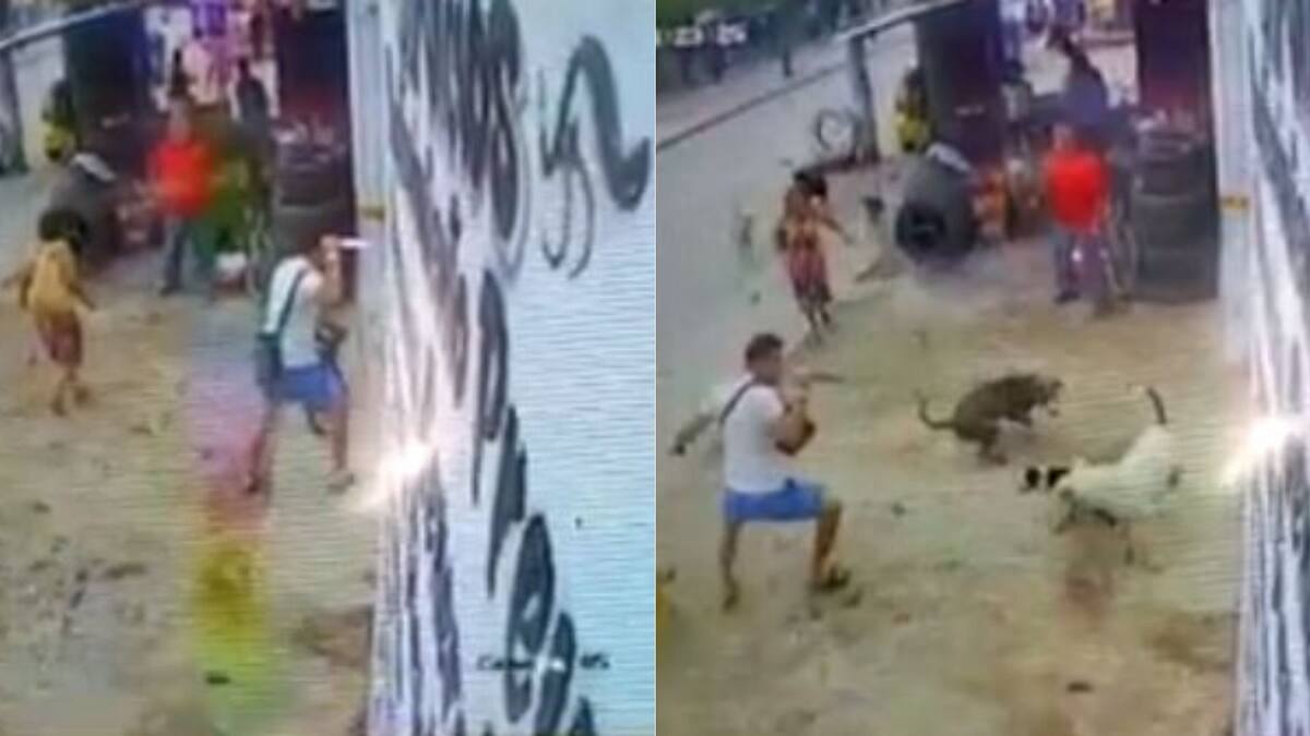 En los videos de las cámaras de seguridad se aprecia cómo uno de los perros sale tras un hombre identificado como Reinaldo Porras Monsalve. Tiempo después, el animal regresa y tras de él, se ve al sujeto, quien lo persigue y saca lo que parece ser un cuchillo, proporcionándole las heridas.