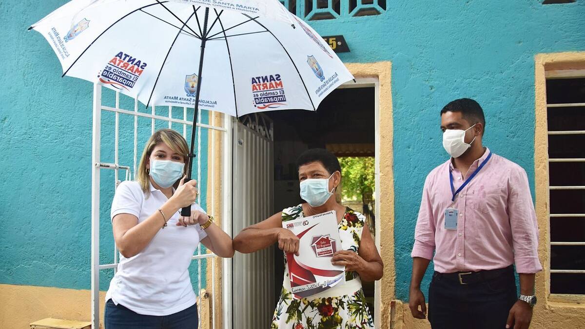 A manos de la alcaldesa de Santa Marta, Virna Johnson, Carmen Cantillo obtuvo el documento que la acredita como propietaria legítima de su predio, en una jornada masiva de titulación de predios, que se llevó a cabo con todas las medidas de bioseguridad debido a la pandemia del coronavirus.