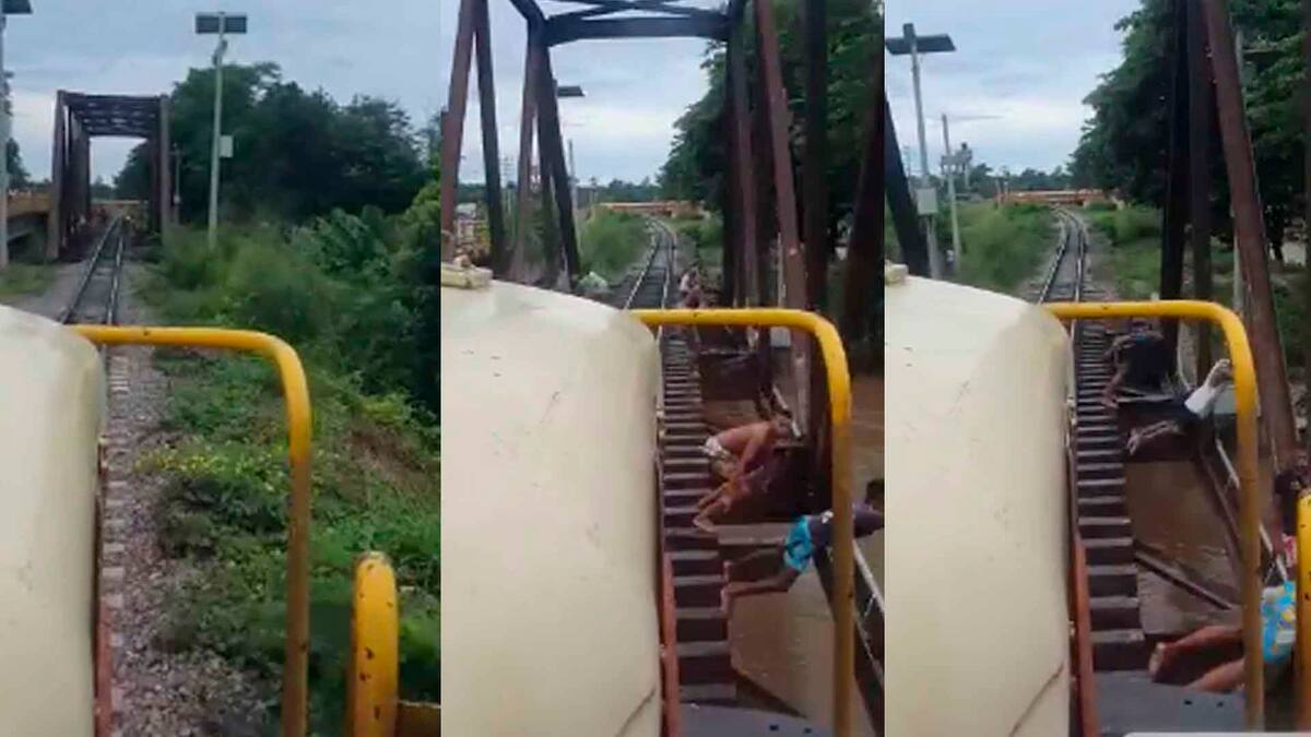 Ubicados sobre los puentes férreos y con frialdad, se lanzan al río a escasos dos metros del paso de la locomotora. Acto seguido celebran la hazaña.