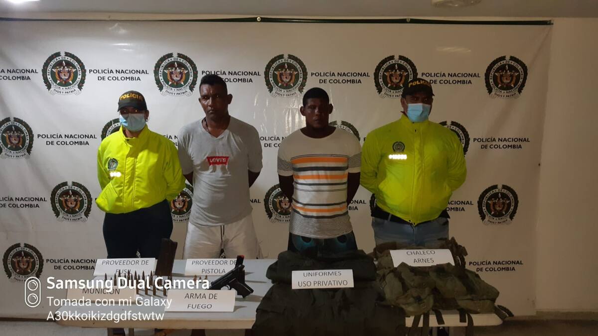 Las autoridades los identificaron Fajit Antonio Herrera Yepez alias ‘el Soldado‘ y Pablo José Ramos Figueroa alias ‘el Mello’, quienes son señalados por los delitos de fabricación, tráfico porte o tenencia de armas de fuego, Fabricación tráfico y porte de armas, municiones de uso restringido, de uso privativo de las fuerzas armadas o explosivos y utilización ilegal de uniformes e insignias.