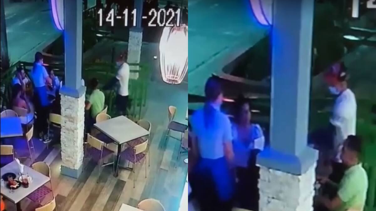 En las cámaras de seguridad del local comercial se logra observar cuando un individuo se acerca de manera sospechosa, se detiene durante varios minutos en la acera pública, luego se decide en ingresa a la terraza donde se encuentra un grupo de personas departiendo en una mesa, los amenaza con un arma de fuego para que le entreguen todas sus pertenencias y al lograr su cometido huye del lugar en una motocicleta conducida por su cómplice.