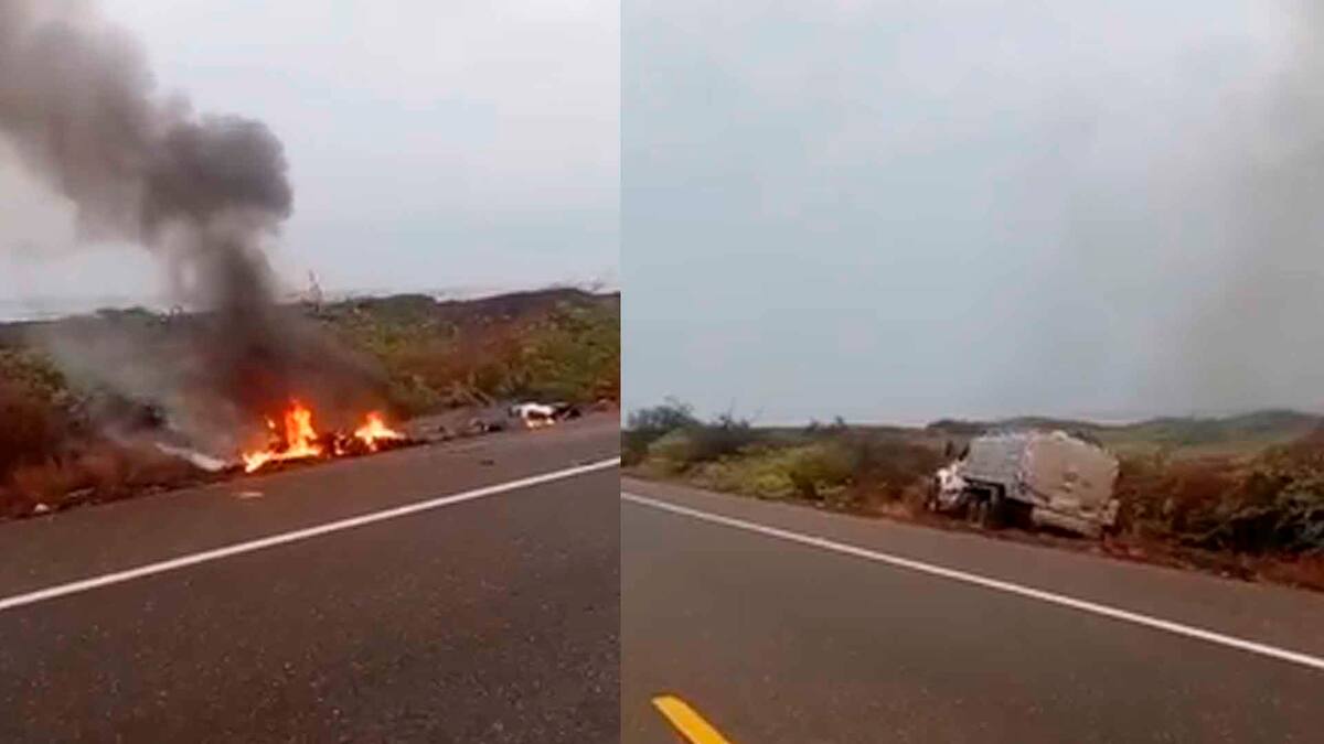 Se conoció que los ocupantes del vehículo de dos ruedas habrían invadido el carril contrario e impactaron de frente con el vehículo transportador de leche, por el choque la motocicleta se incineró y uno de los cuerpos quedó calcinado.