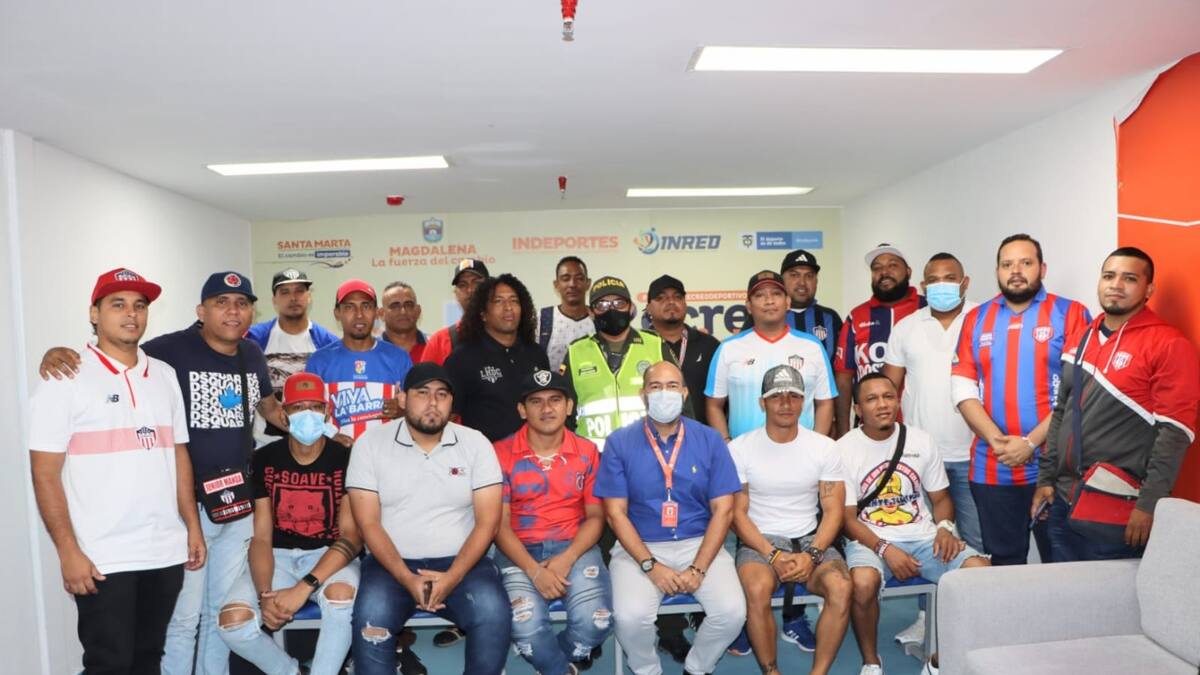La Comisión Local de Santa Marta para la Convivencia y Paz en el Fútbol, integrada por las secretarías de Gobierno, Seguridad, Movilidad, Salud, Ogricc, Dadsa, Policía Nacional e Instituto Distrital de Recreación y Deportes, charló con los integrantes de las barras ‘La Hinchada’ y ‘Garra Samaria Norte’ del cuadro samario y ‘Bloke Central’, ‘Frente Rojiblanco’ y ‘Los Kuervos’ del equipo de la capital del Atlántico, con el fin de coordinar el ingreso al estadio de manera armónica.