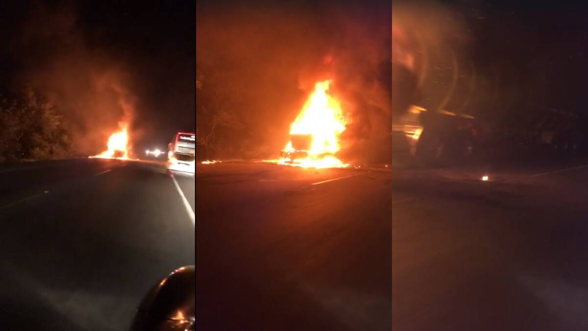 En el video de 17 segundos se observa como las llamas consumen un camión que transportaba gasolina en medio de la carretera.