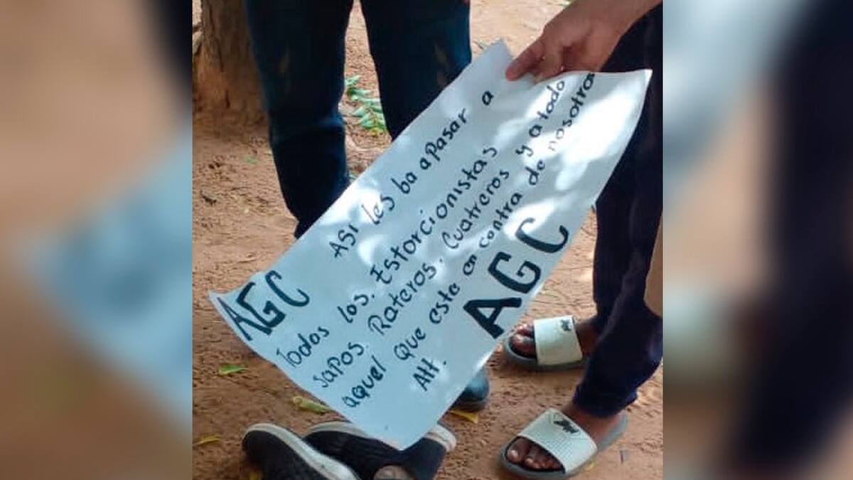 Finalmente, se conoció que el sitio donde fue encontrada baleada la víctima, también hallaron un cartel que dice: 'así les va a pasar a todos los extorsionistas, sapos, rateros, cuatreros y todo aquel que esté en contra de nosotros', Autodefensas Gaitanistas de Colombia (AGC) o también llamados ‘Clan del Golfo’.