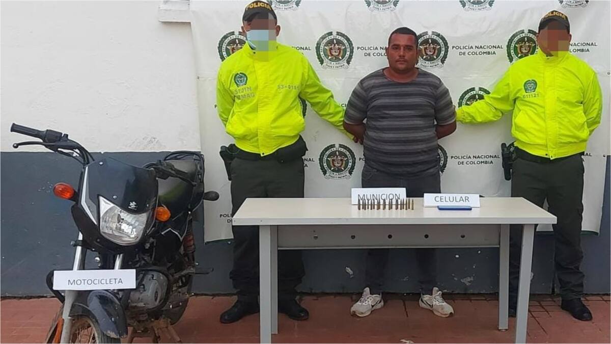 Durante la captura se le incautaron 40 cartuchos calibre 5.56 mm, un teléfono celular marca Huawei, una motocicleta Auteco Bóxer.