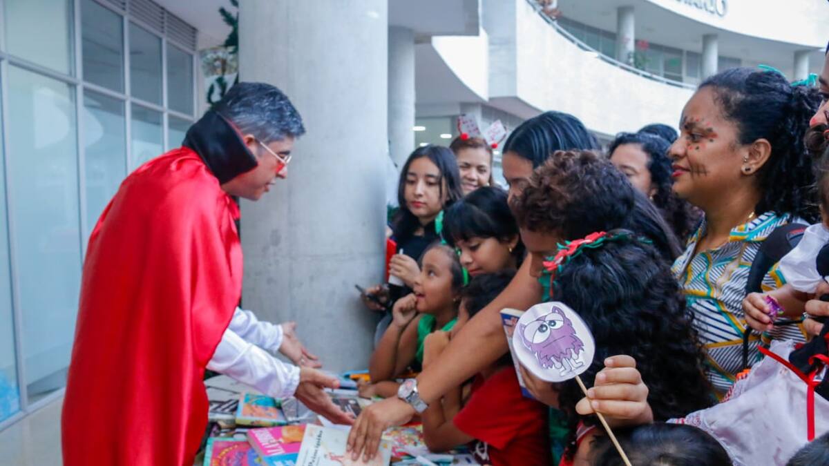 El rector Pablo Vera Salazar, quien lideró el ‘Triqui Triqui… Quiero libros para mí', estuvo personificando a ‘Drácula’ pero esta vez con un nombre y características de su imaginación denominada Draco quien se inmortaliza a través de los libros y en vez de la sangre prefiere devorar páginas.