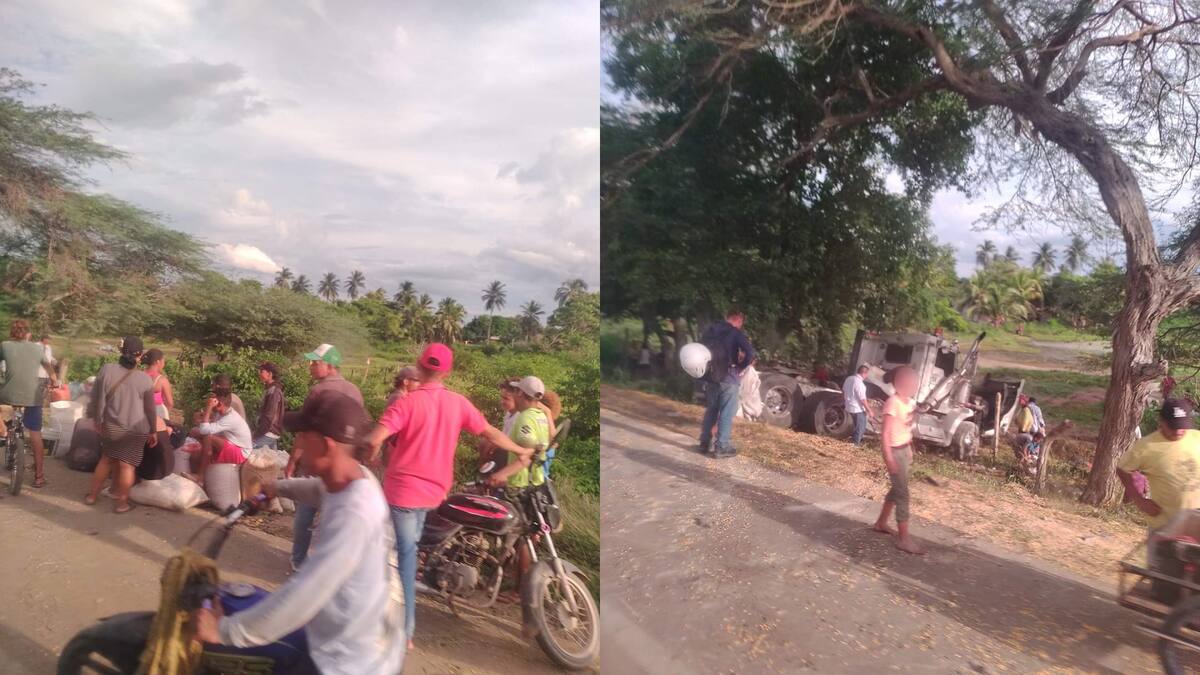 En videos compartidos por usuarios en redes sociales se ve que el camión, que iba cargado de maíz, quedó a un costado de la vía mientras que decenas de personas, incluidos menores de edad, llenaban grandes costales del producto para sacarlo de allí en diferentes medios de transporte.