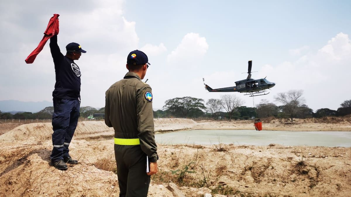 'Debido a la complejidad de la zona fue necesario desplegar desde el Comando Aéreo de Combate No.3 un helicóptero Bell-212 con el sistema Bambi Bucket para realizar descargas de agua sobre la parte alta de la montaña donde se concentran algunos de los focos más grandes y dificulta la llegada del personal de bomberos de Fundación y Algarrobo', refirió la institución.