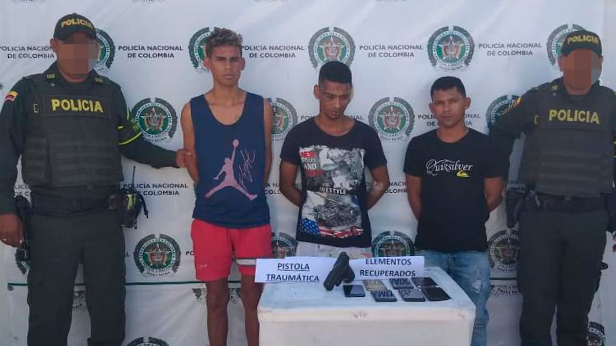 'Al escuchar unas voces de auxilio dentro de un vehículo, donde viajaban de 30 personas, se encuentra tres hombres intimidando con un arma neumática, con el fin que cada persona entregara su celular personal, inmediatamente los uniformados reaccionan logrando la captura de estos tres sujetos junto con la recuperación e incautación del arma neumática', indicó el coronel Óscar Solarte, comandante de la Policía Metropolitana de Santa Marta.