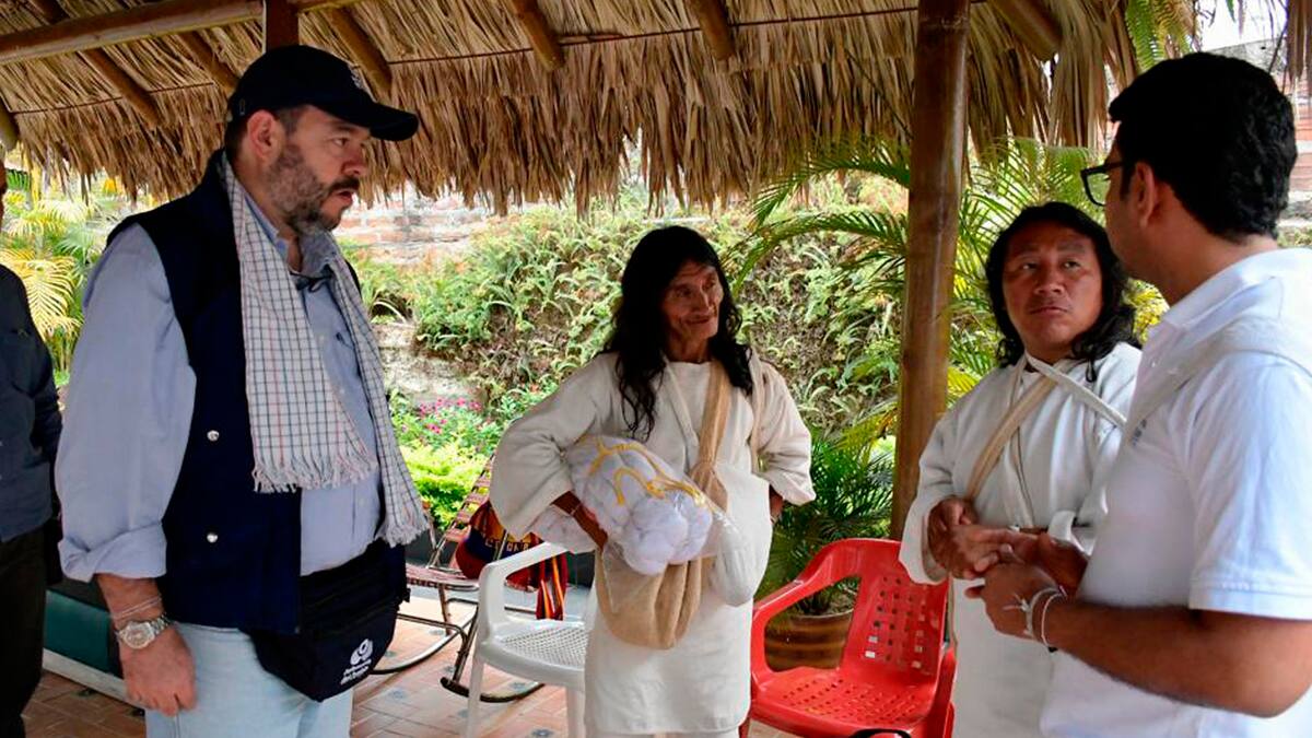 Antes de sostener la reunión, los funcionarios recibieron por parte del mamo kogi, Jose Nokogui Awigui, autoridad tradicional, el permiso para ingresar a la sierra. El hombre impuso sobre las muñecas de los integrantes de la misión unas tiras de lana blanca como muestra de que eran bien recibidos al pueblo.