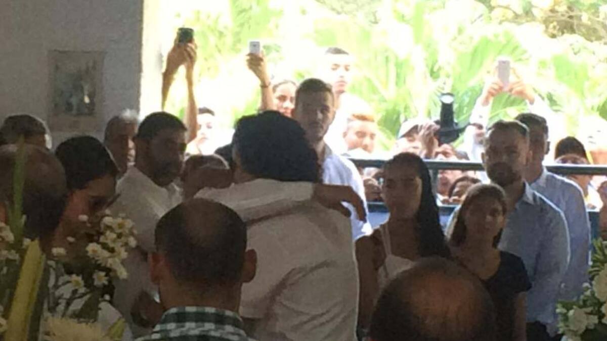 El ganador de varios premios Grammy, irrumpió la ceremonia y llegó hasta la parte de adelante de la iglesia, donde abrazó al Tigre y a su esposa Lorelei Tarón, a quienes abrazó fuertemente y les expresó su tristeza por la pérdida de su progenitor, a quien apreció como futbolista.