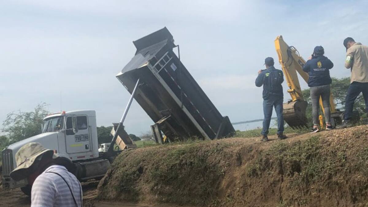 Una de las retroexcavadoras se encuentra en un predio particular, ubicado en dirección a El Piñón, efectuando las plataformas de ingreso para las volquetas que acopiarán el material de geobolsas, cada una con capacidad para 15 toneladas.
