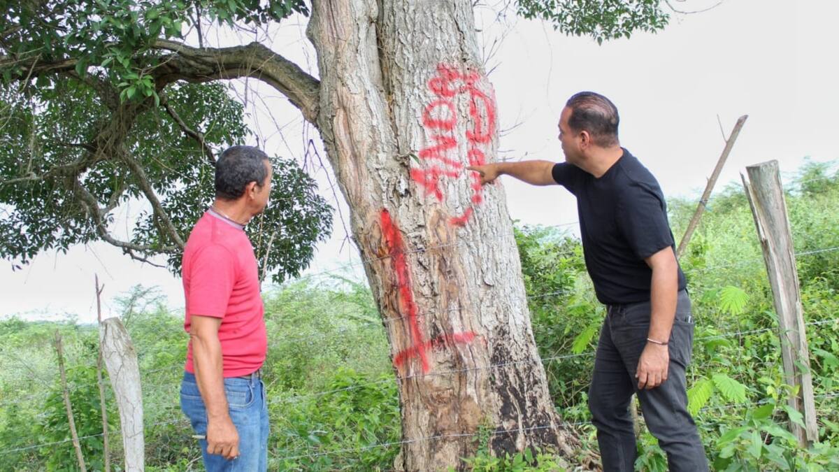 Árboles y cercas son marcadas con aerosol rojo, como delimitando los predios a invadir.