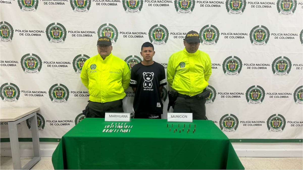 Mediante diligencia de registro y allanamiento en el barrio 5 de Febrero, de Santa Marta, efectivos de la Policía Metropolitana, a través de la Seccional de Investigación e Inteligencia Policial en coordinación con la Fiscalía 19 Seccional URA, dieron con la captura de José Gabriel Montero, alias Jova Perreo, por el delito de fabricación, tráfico, porte o tenencia de armas de fuego y de estupefacientes con la incautación de 37 cigarrillos de marihuana y varios cartuchos de calibre 38 y 9 milímetros.