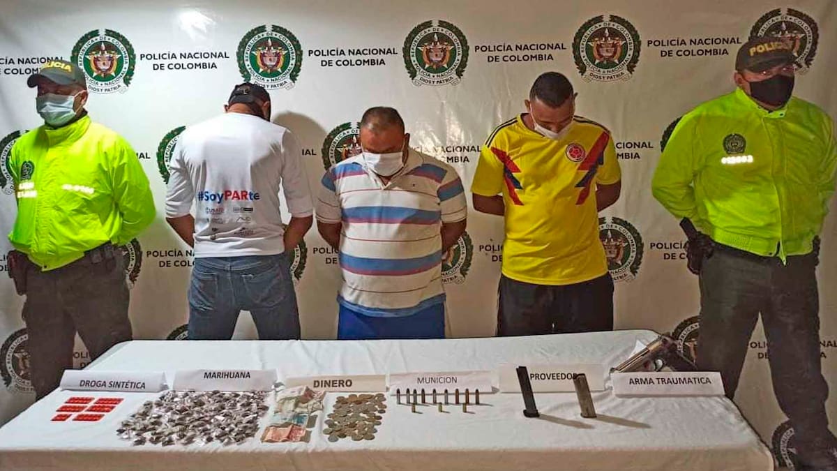 Igualmente, se encontraron en poder de los indiciados 58 pastillas de clonazepam, una pistola traumática, un cargador de pistola calibre .9 milímetros, nueve cartuchos calibre 38 y $27.000 pesos en efectivo producto de la comercialización de dichas sustancias ilícitas.