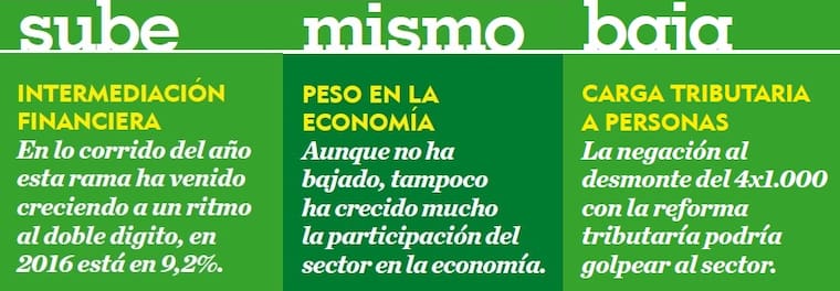 A pesar de estos hechos, el 2016 para el sector financiero dio buenos resultados. Hasta noviembre del año pasado fue el sector que más creció, con un incremento de 4,3% igualando los niveles registrados al cierre del año anterior. La rama con mayor peso del sector es la de actividades inmobiliarias y alquiler de vivienda, aunque la que registra mayor crecimiento es la de intermediación financiera.
