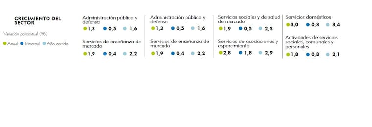 En el último trimestre, el valor agregado del sector creció un 1,8% frente al mismo trimestre de 2015 explicado por los siguientes comportamientos: servicios domésticos en 3,0%; servicios de asociaciones y esparcimiento, culturales, deportivos en 2,8%; servicios sociales (asistencia social) y de salud en 1,9%; servicios de enseñanza de mercado en 1,9% y servicios de administración pública y defensa en 1,3%. Respecto al trimestre inmediatamente anterior, la rama creció en 0,8%. Esta variación se explica por el incremento en servicios de asociaciones y esparcimiento, culturales, deportivos en 1,8%; servicios de administración pública y defensa y servicios sociales (asistencia social) y de salud en 0,5% cada uno; servicios de enseñanza de mercado en 0,4%; y servicios domésticos en 0,3%.