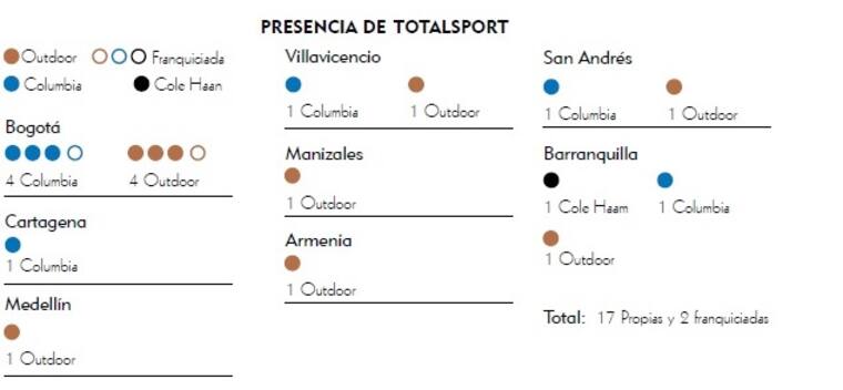 Mercado nacional. TotalSport, filial de Grupo Sport con casa matriz en Panamá, nació por la necesidad de tener presencia en Colombia de forma directa e iniciar un posicionamiento que empezó en 2011. Cuatro años después de su ingreso al mercado nacional con una tienda concepto de Columbia, se ha expandido con 11 marcas y 20 tiendas en siete ciudades.