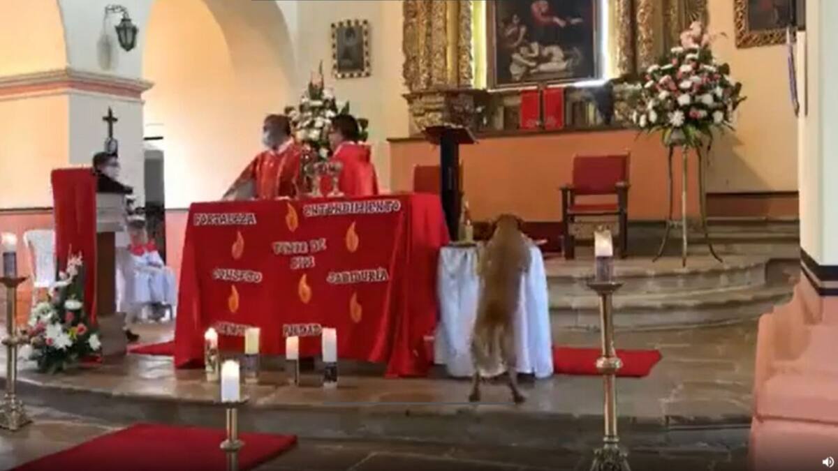 En las imágenes, se observa cómo el animal se dirige sigilosamente hasta la mesa, al lado del altar, donde se encontraba el alimento mientras el sacerdote oficiaba la eucaristía.
