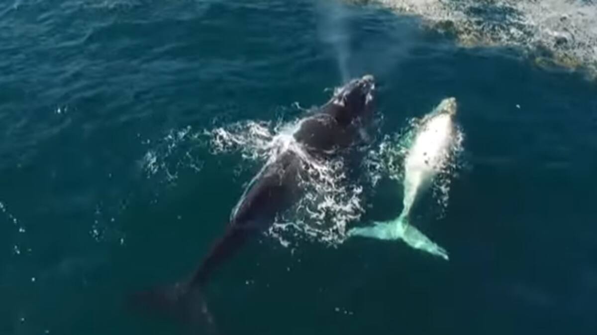 Una madre ballena y su cría albina fueron captadas por un drone mientras se encontraban paseando en el océano.