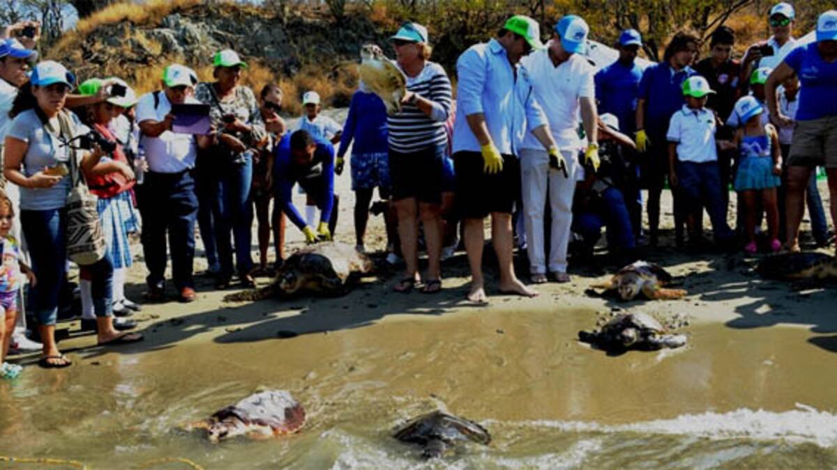 Las tortugas de tipo Carey, Verde y Caguama y los tiburones nodrizas fueron liberados por niños que celebraron alborozados el regreso de estos al mar.