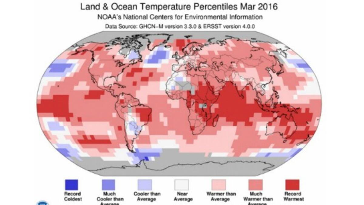La Administración Nacional Oceánica y Atmosférica (NOAA) de Estados Unidos dijo el martes que la temperatura promedio global en marzo de 13,94 Celsius (54,9 Fahrenheit) fue no solamente el marzo más caliente, sino que continúa una racha iniciada en mayo.
