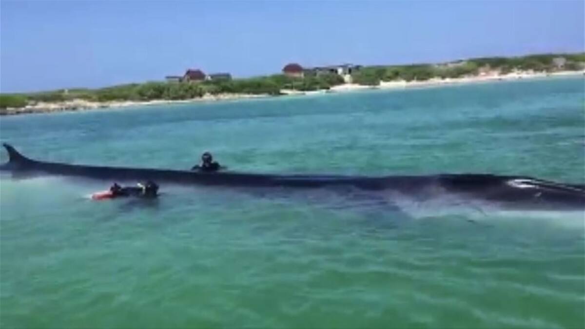 Una ballena de 18 metros de la especie conocida como rorcual de aleta o rorcual común fue rescatada tras quedar varada en el Caribe mexicano.