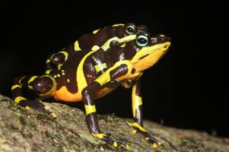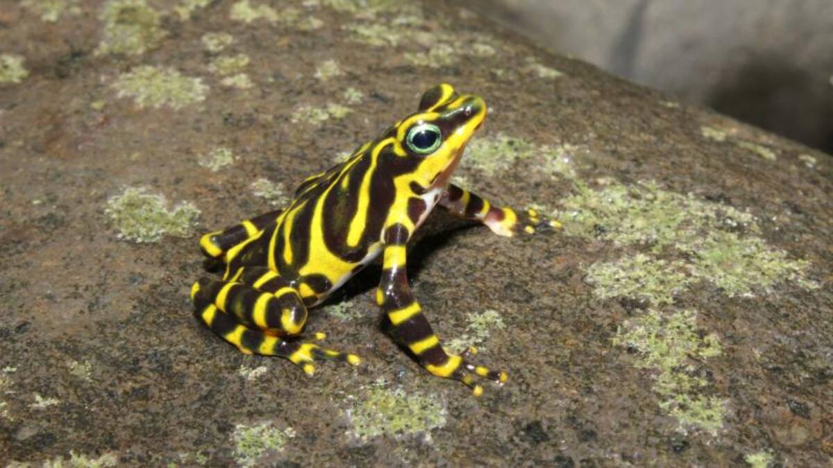 La rana, de color amarillo y negro y de diminuto tamaño, pertenece a un grupo de anfibios de la familia Bufonidae, en peligro de extinción.