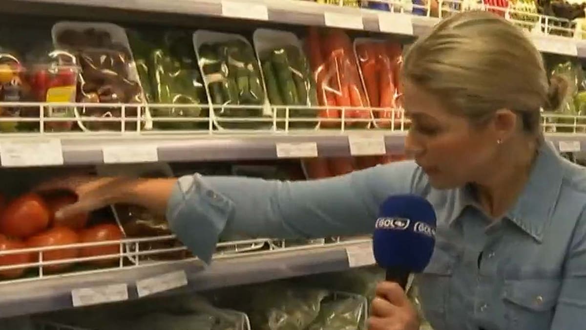 En su cubrimiento, emitido a través del noticiero, la periodista tomó nota de los productos. Unos los iba ubicando en el carro de mercar, mientras que otros solamente los tomaba en su mano y posteriormente devolvía a su lugar de asignación.