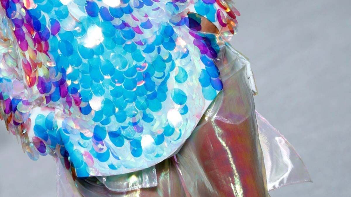 El plexiglas y el PVC van ganando terreno en la pasarela: el director artístico de Paco Rabanne, Julien Dossena, reinterpretó la emblemática cota de malla de la firma utilizando piezas de plexiglás y metal hilvanadas con remaches.