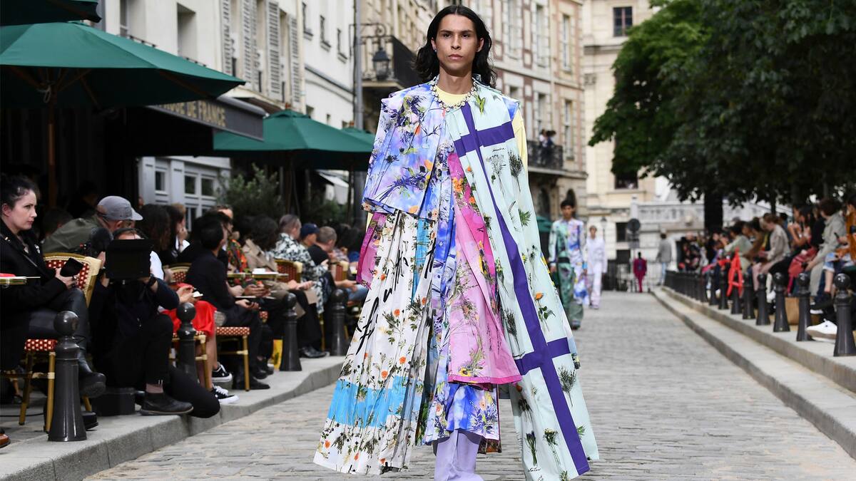 Su colección para la próxima primavera-verano es una apuesta estilística de aires juveniles, con la que el hombre ya tiene completamente asumido su lado más femenino, con faldas, tonos rosas y sobre todo flores.