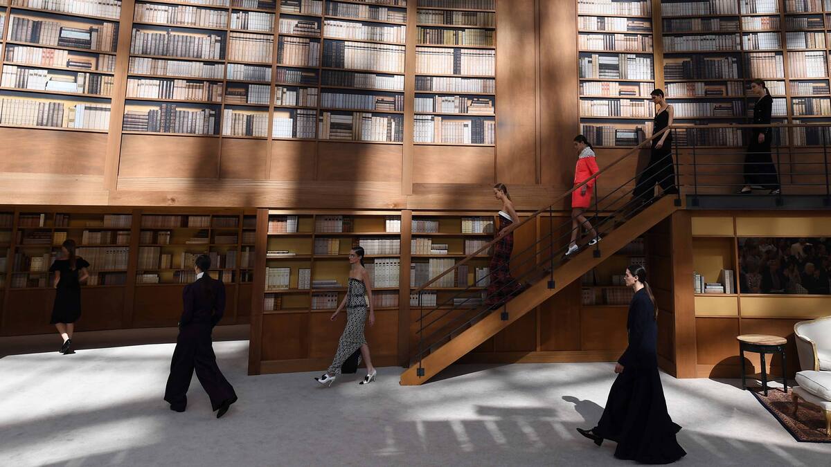 La discreta diseñadora, que como Lagerfeld nunca reveló su edad, mantuvo hasta sus imponentes decorados, eligiendo para el desfile uno de los temas predilectos del maestro: los libros.